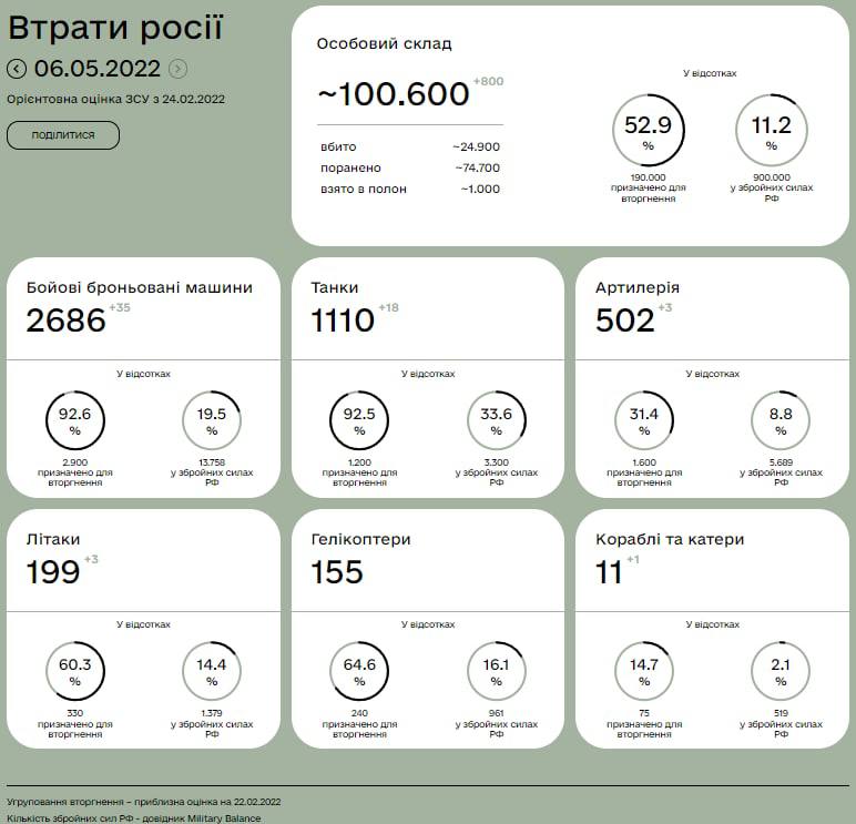 Статистика втрат РФ у відсотках станом на 06.05.2022. 👇🏻