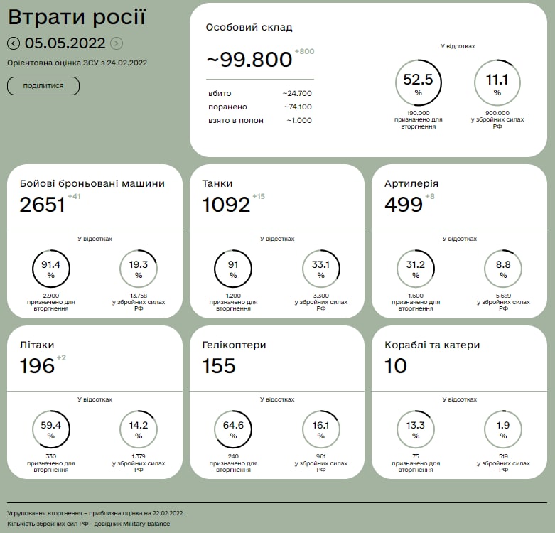 Статистика втрат РФ у відсотках станом на 06.05.2022. 👇🏻