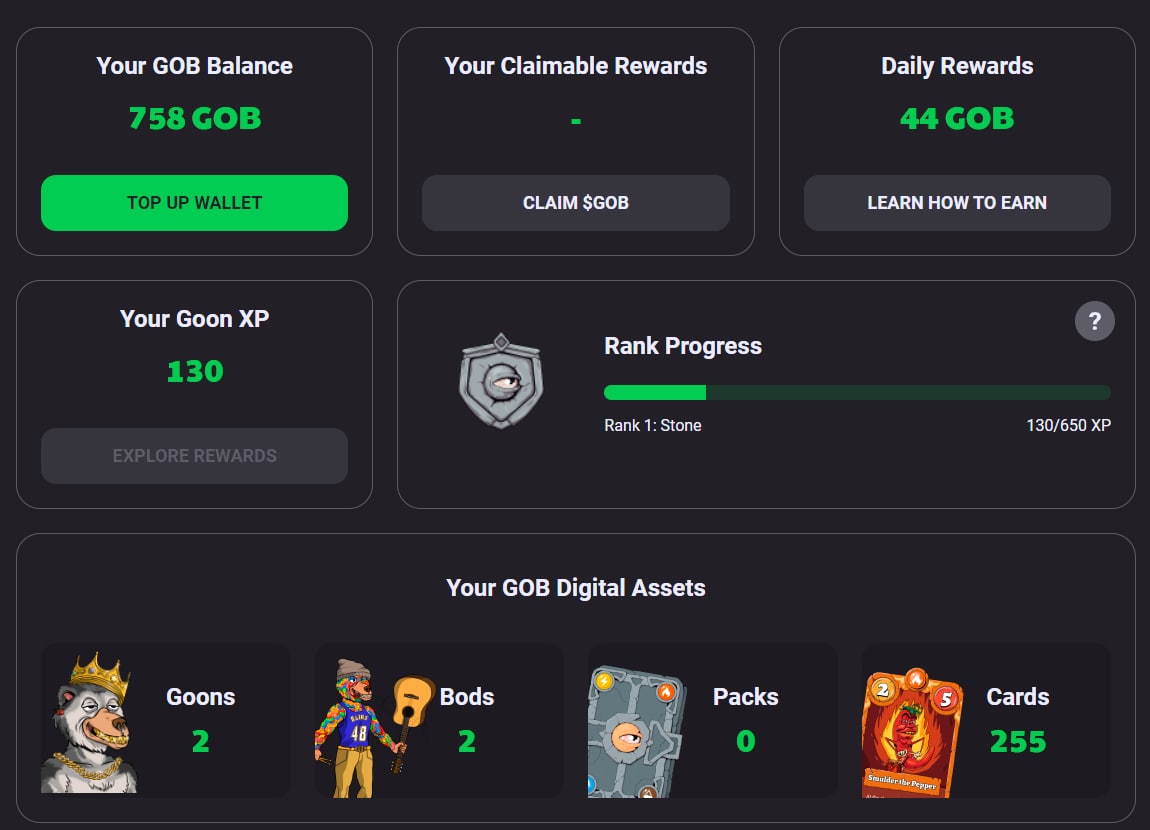 GOB - Goons Of Balatroon это игра, которая подойдет любителям Hearthstone. За основу взята карточная игра, где 2 персонажа сражаются на игровом поле. Но в отличии от херстоуна, карты, аватары, земли и прочее здесь можно покупать и продавать за эфир.