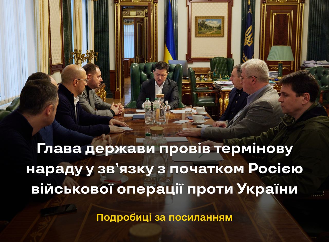 У зв’язку з початком Росією військової операції проти України Президент Володимир Зеленський провів термінову нараду з керівництвом уряду, представниками оборонного сектору та економічного блоку.