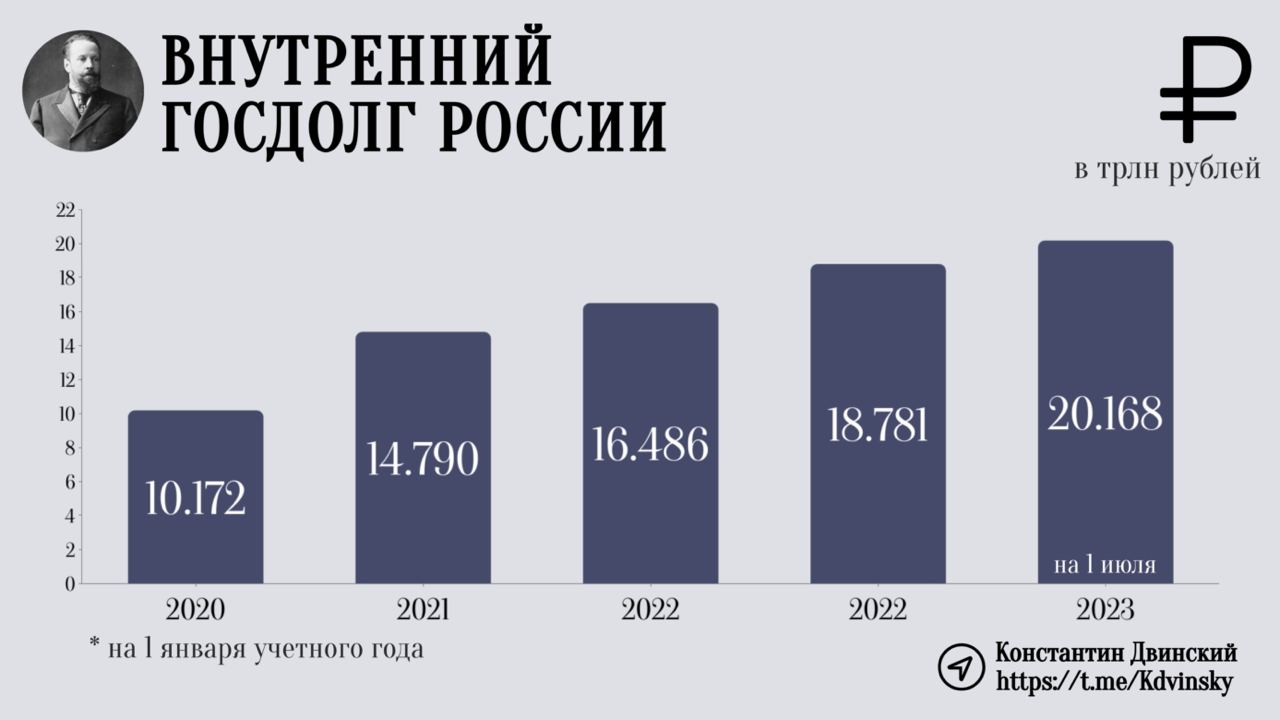 Учитывая, что внешний госдолг в последние годы практически не растет и, даже, чуть сокращается, рассмотрим динамику внутреннего долга. И здесь мы видим его существенный рост с 1 января 2020 года. Если на тот момент значение составляло 10,17 трлн рублей, то на 1.07.23 - уже 20,17 трлн. Рост в два раза.