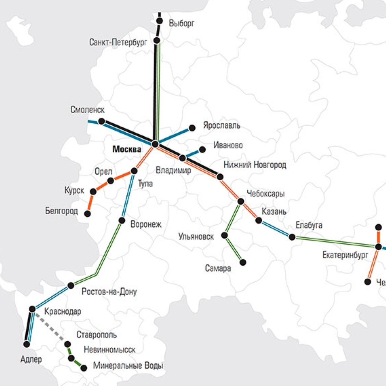 И в конце самое главное. Развитие высокоскоростного железнодорожного сообщения предполагается не только по линии Москва - Санкт-Петербург. В России стартует комплексная программа строительства ВСМ. Проект на Северную столицу будет пилотным, однако планируется построить магистрали на юг до Адлера и на восток до Екатеринбурга.