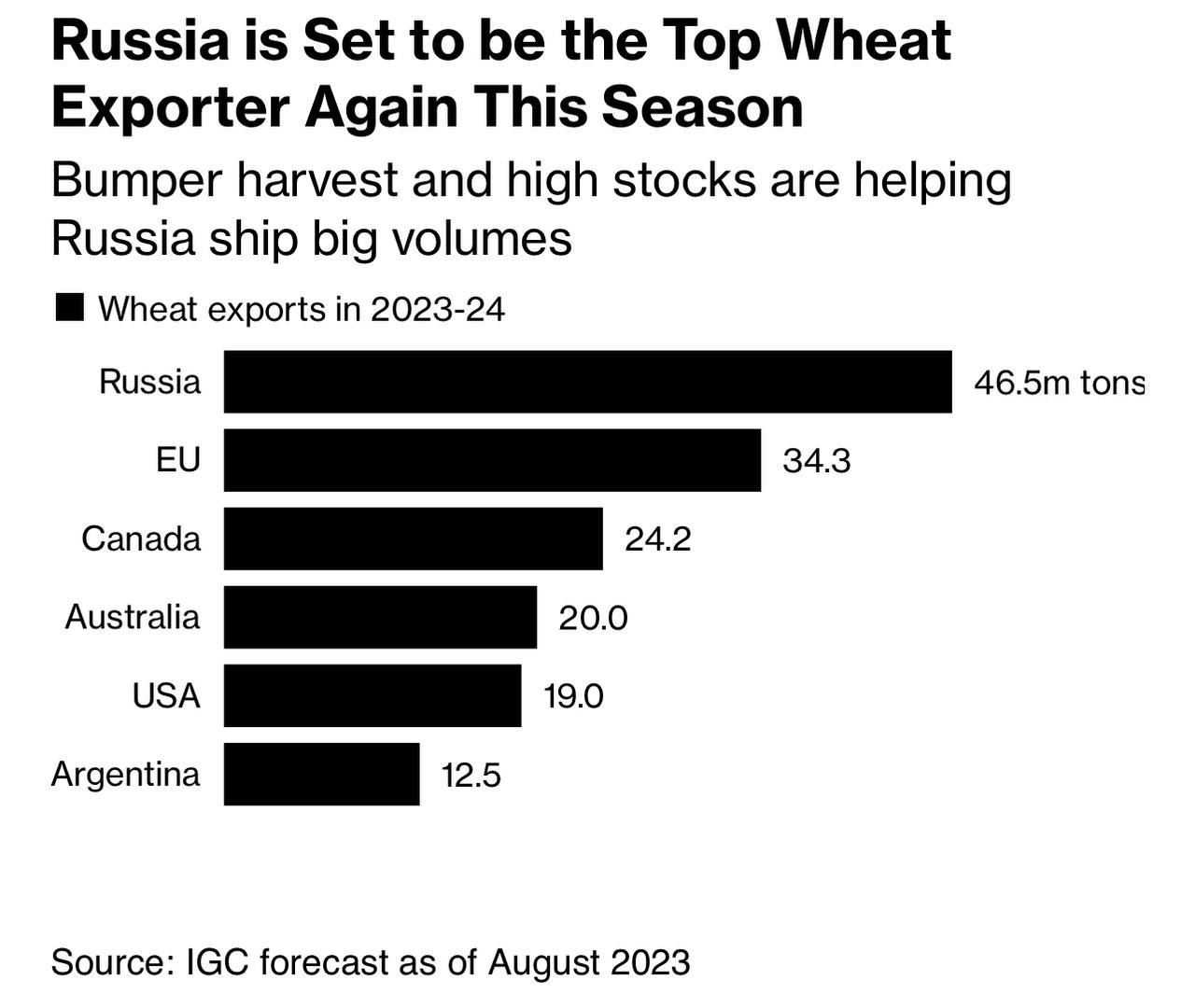 А что Россия? Готовится занять первое место в мире по экспорту пшеницы за 2023-2024 сельскохозяйственный год (с 1 июля по 30 июня). Обогнав весь Евросоюз и, например, Канаду, которая долгое время была в данном вопросе лидером. Кстати, считается, что в своё время Уинстон Черчилль в качестве реакции на начало закупок зерна СССР в Канаде и США в 1963 году заявил: "Я думал, что умру от старости. Но когда Россия, кормившая всю Европу хлебом, стала закупать зерно, я понял, что умру от смеха". Ну что, же, сейчас смеяться ему бы не пришлось. Россия вот уже несколько лет подряд занимает абсолютное мировое лидерство по пшенице.