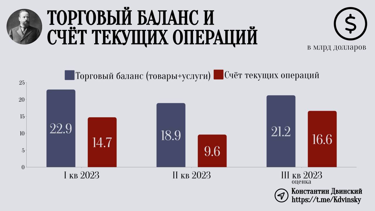Все предыдущие месяцы глава ЦБ Эльвира Набиуллина утверждала, что основной причиной девальвации рубля является сокращение профицита торгового баланса и счета текущих операций. Якобы экспорт упал, а импорт восстановился до значений 2021 года. С одной стороны это, действительно, так, но только если мы сравниваем ситуацию с аномальным 2022 годом, когда было всё наоборот.