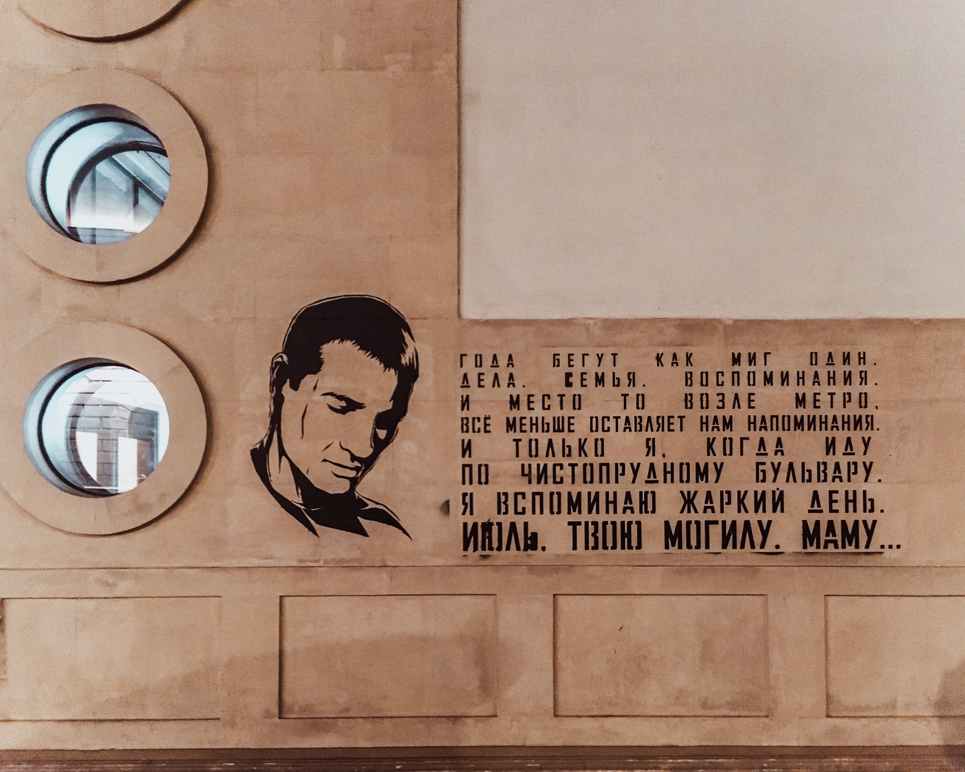Граффити у входа в метро «Чистые пруды». Посвящено 10-летней годовщине гибели Юрия Волкова.