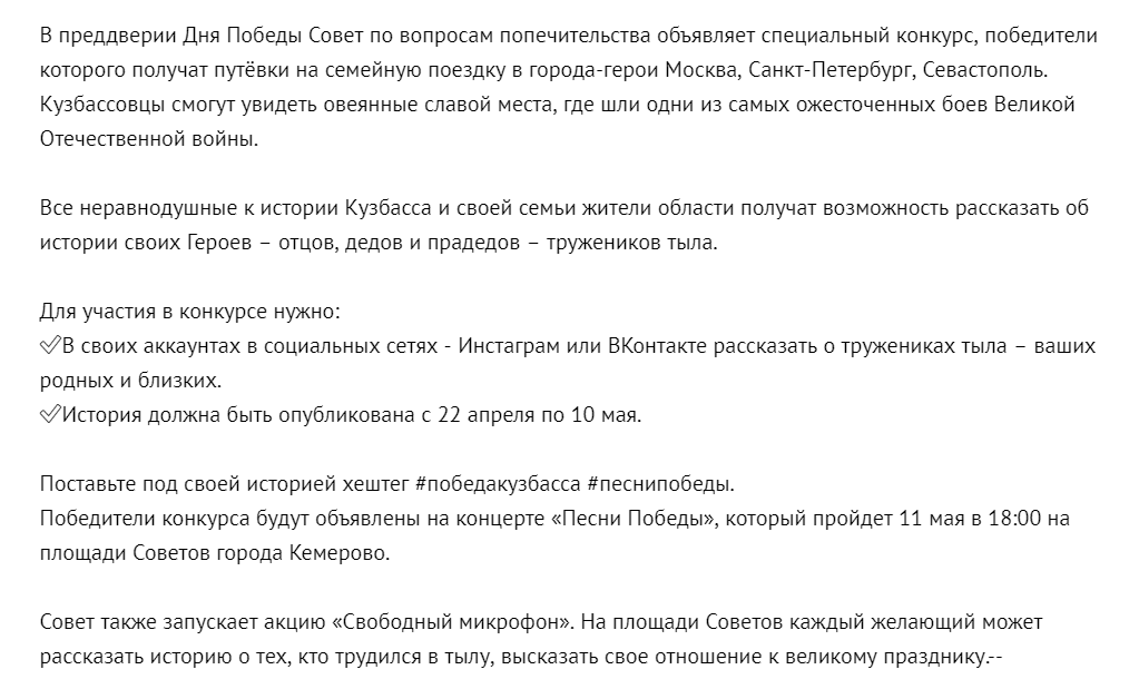 Совет по вопросам попечительства объявил конкурс, посвященный Дню победы. Победители смогут поехать в города-герои Москва, Санкт-Петербург и Севастополь. Для участия в конкурсе необходимо в Инстаграм или ВКонтакте разместить свой рассказ о родственниках тружениках тыла или участниках боевых действий.