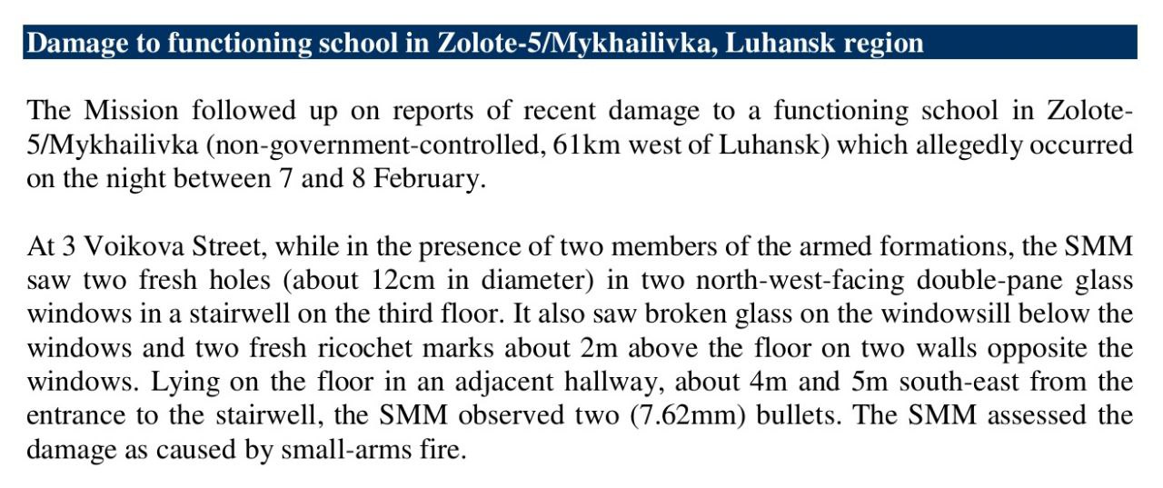 "Миссия уточняла сообщения о недавних повреждениях действующей школы в с. Золотое-5 / Михайловка (неподконтрольный правительству, 61 км к западу от Луганска), которые предположительно произошли в ночь с 7 на 8 февраля. На улице Войкова, 3, в присутствии двух членов вооруженных формирований, наблюдатели видели две свежие дыры (около 12 см в диаметре) в двух окнах с двойным стеклопакетом, выходящих на северо-запад, в подъезде на третьем этаже. Также было замечено разбитое стекло на подоконнике под окнами и две свежие рикошетные отметины примерно в 2 м над полом на двух стенах напротив окон. Лежа на полу в соседнем коридоре, примерно в 4 м и 5 м к юго-востоку от входа на лестничную клетку, наблюдатели видели две пули (7,62 мм). По оценке СММ, повреждения причинены огнем из стрелкового оружия".