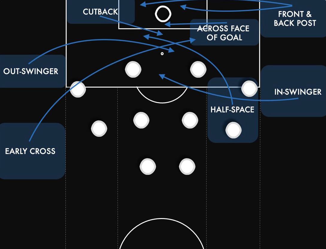 Одним из главных инструментов в футболе являются подачи (кроссы, навесы - кому как удобнее) в штрафную площадь, но даже в этом случае существует множество вариантов использования данного инструмента.