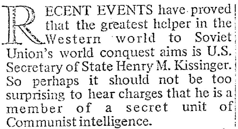 — Кіссінджер виступав за стратегічну співпрацю з СРСР і Китаєм, політики, що подовжили життя радянському режиму і призвели до багатьох «компромісів» і «розподілів сфер впливу» від яких страждали люди. Відлига у відносинах між Китаєм (який в той час проводив кампанію масових репресій, «Велику культурну революцію») та США прямо призвели до вторгнення Китаю у В‘єтнам