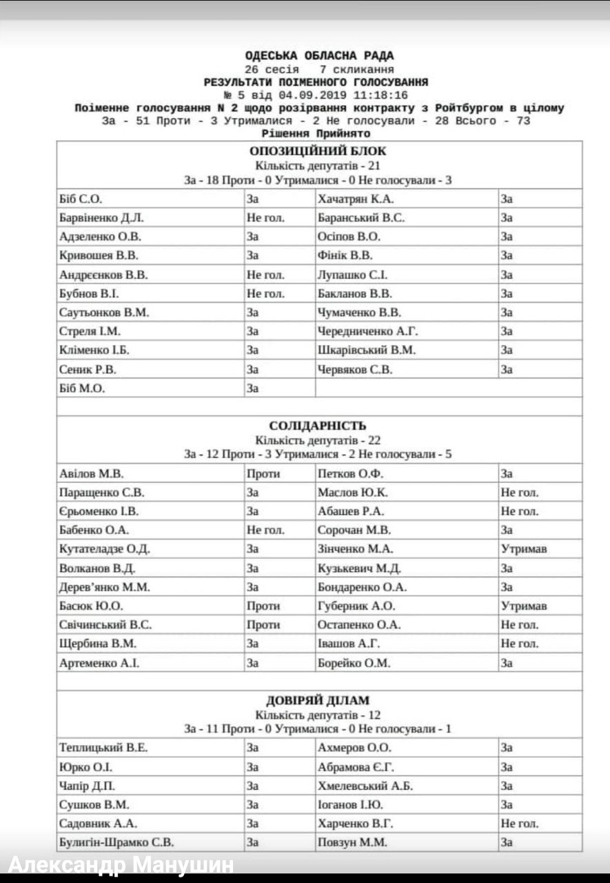 А вот и результаты голосования за увольнение Александра Ройтбурда с должности главы Одесского областного совета. Вы видите синхронное голосование фракции Медведчука “Оппозиционный блок”, фракции Труханова “Доверяй делам” и фракции Порошенко “Солидарность”, куратором которой является хорошо известный Алексей Гончаренко. Как вам такой союз Порошенко-Медведчука?