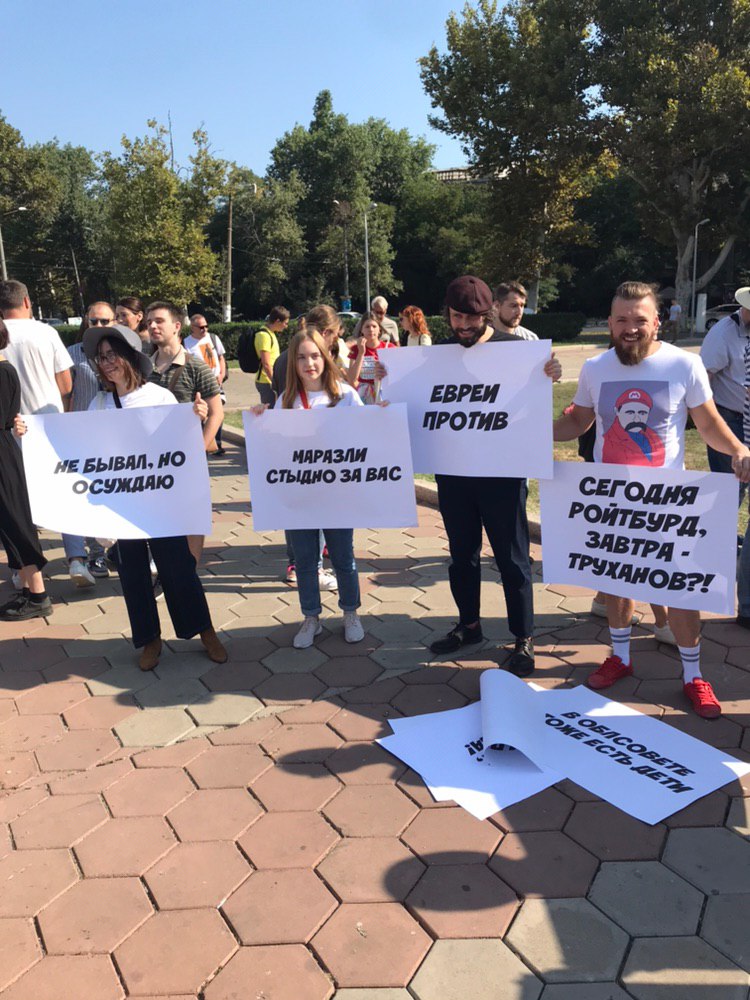 Об этой афере я писал пару дней назад в телеграме, прокрутите, если интересно. Я сам в Одессе и передаю с месте событий: такой масштабной акции не было в городе за последние пять лет. В поддержку Ройтбурда собралось не менее полутысячи человек, при том, что это утро субботы. Люди подписывают петиции и держат плакаты в поддержку художника, некоторые - с откровенным троллингом властей.