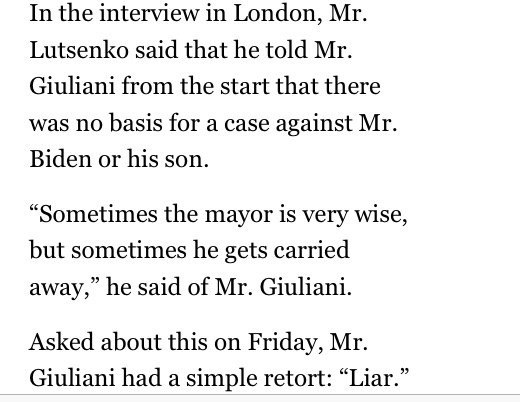 Но при этом в лондонском интервью “Нью-Йорк Таймс” Луценко сказал, что якобы с самого начала говорил Джулиани, что нет никаких оснований для дела против Джо Байдена или его сына. “Иногда мэр очень мудр, но иногда он увлекается», - добавил Луценко о Джулиани.