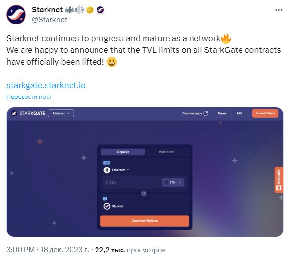 Starknet повідомили, що знімають будь-які ліміти TVL для всіх контрактів StarkGate