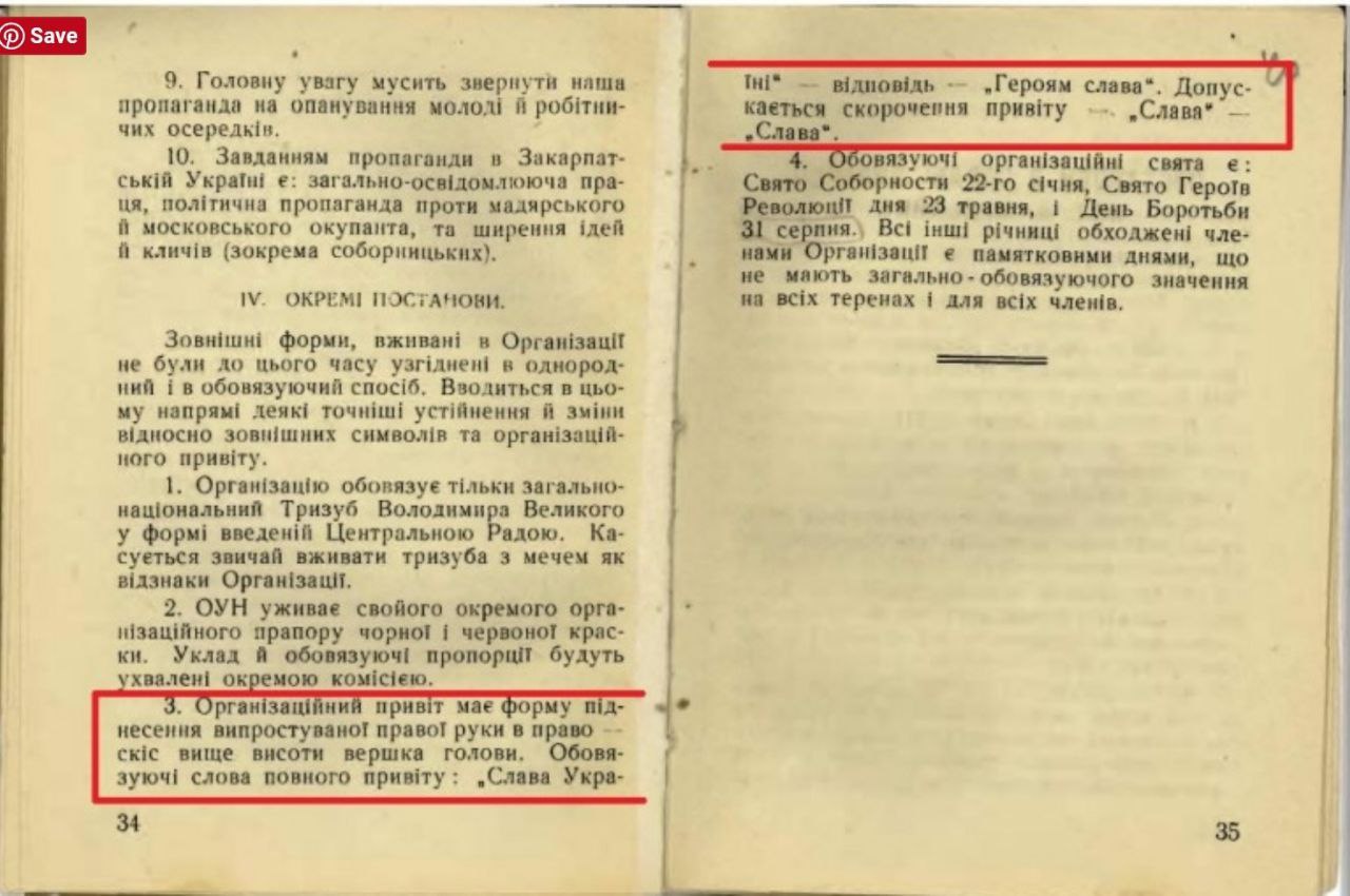 "The organizational greeting of the [OUN] has the form of raising the outstretched right hand to the right - at a level above the top of the head. Required words of the greeting greeting: "Glory to Ukraine" - "answer -"Glory to the heroes" can also be abbreviated to - "Glory"-"Glory"."
