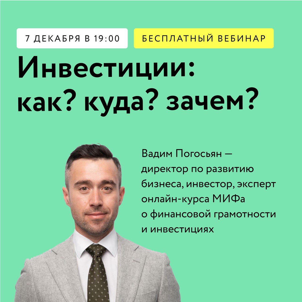 Приглашаем вас на бесплатный вебинар с инвестором, финансовым консультантом и экспертом курса «Кошелек и жизнь» Вадимом Погосьяном → mif.to/invest