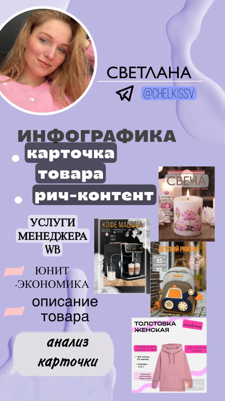 Я стремлюсь к развитию и готова применить свои знания и опыт для достижения ваших целей. Если вам нужен профессионал в области инфографики для маркетплейса WB, то я готова помочь. Связаться со мной можно по ссылке https://t.me/chelkissv