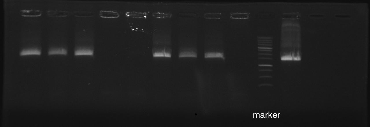 🧬 Клонирование gag в лентивирусную плазмиду прошло успешно! Это подтверждается фотографией электрофореза в агарозном геле. Все, кроме маркера, — это последовательность gag, поднятая методом ПЦР с плазмиды, полученной после клонирования.