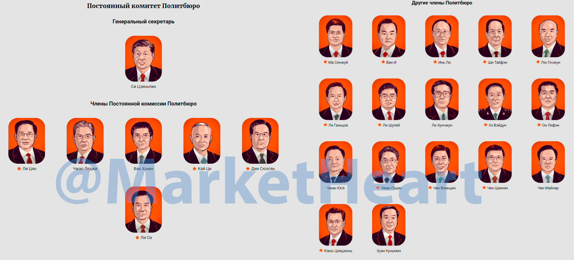 Помимо перестановок Постоянного комитета (7 человек) Политбюро КПК, интересно посмотреть на биографию некоторых новых (на картинке помечены ⭐️) членов Политбюро: