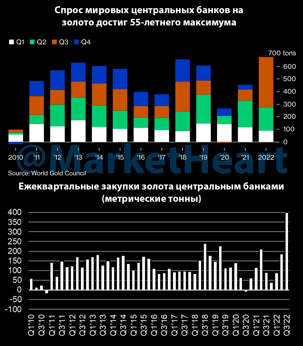 Мировые центральные банки по полной загрузились золотом в третьем квартале 2022 года — спрос достиг 55-летнего максимума.