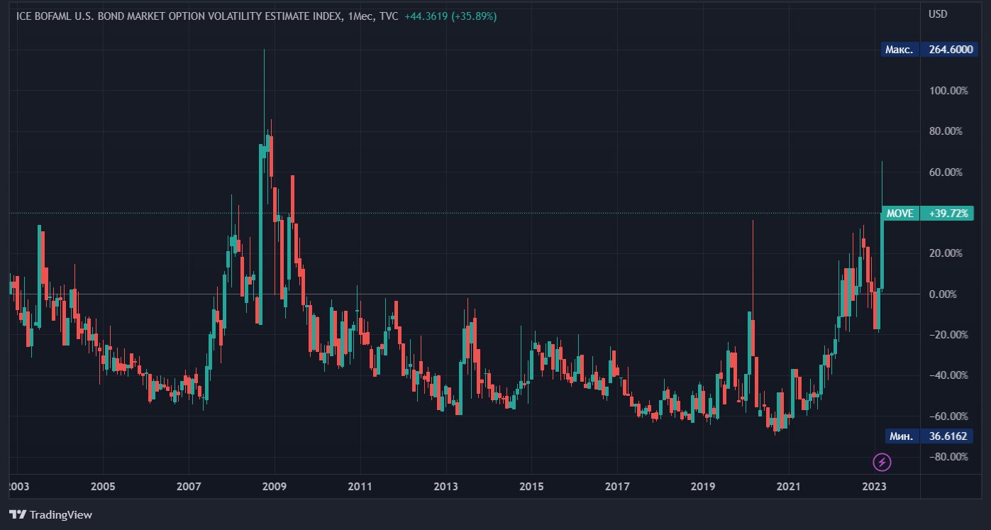 Почему так вышло? Достаточно взглянуть на график волатильности казначеек (в приложении ниже). Второй по величине скачок на рынке облигаций за последние 30+ лет.