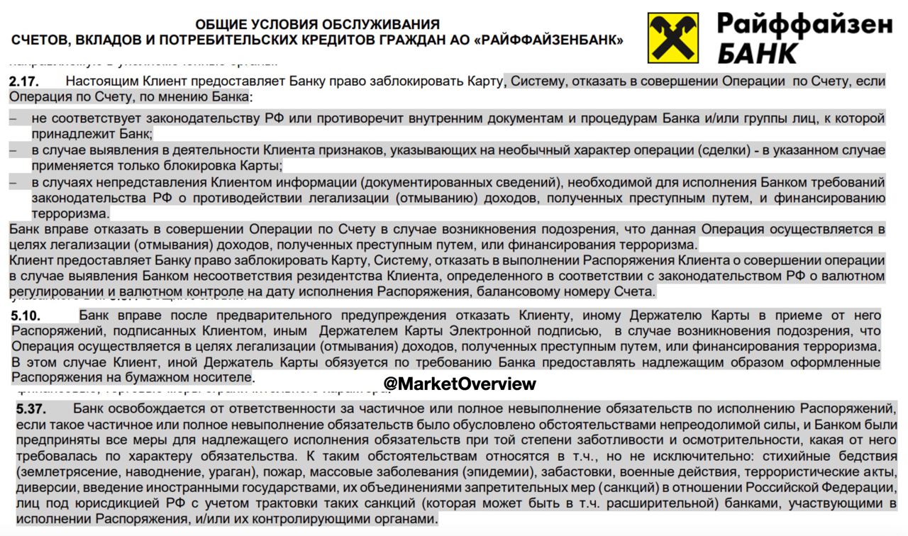 • нарушает законодательство РФ, противоречит внутренним Правилам Райффайзенбанка и Raiffeisen Bank International (RBI). Очень тонко сюда можно отнести неуведомление о смене налогового резидентства, и очень прямо - внутренняя политика RBI может влиять на российский Райф. Главный акционер и раньше влиял на все процедуры, но сейчас это четко закрепили под формулировкой «Клиент предоставляет Банку право заблокировать»;