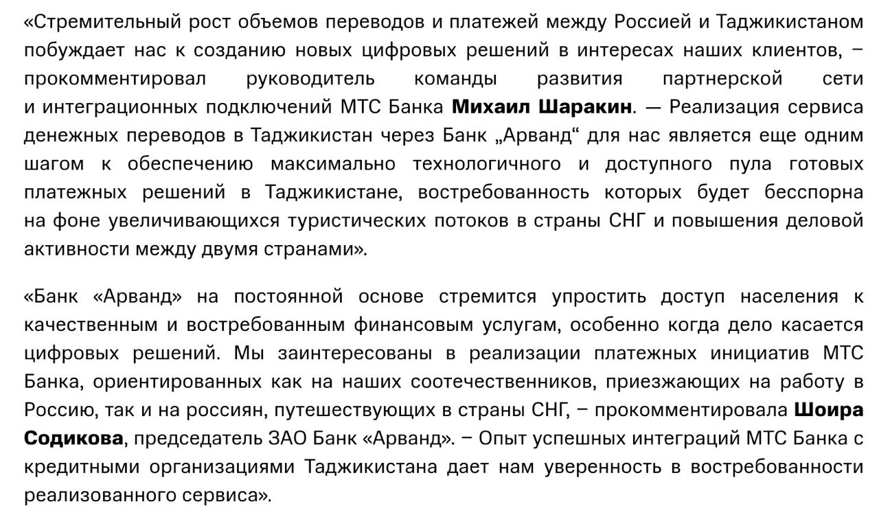 Приложение МТС Банка - Платежи - Оплата - Переводы в СНГ/Дальнее зарубежье - Банк Арванд Таджикистан - вводите номер телефона получатели и сумму