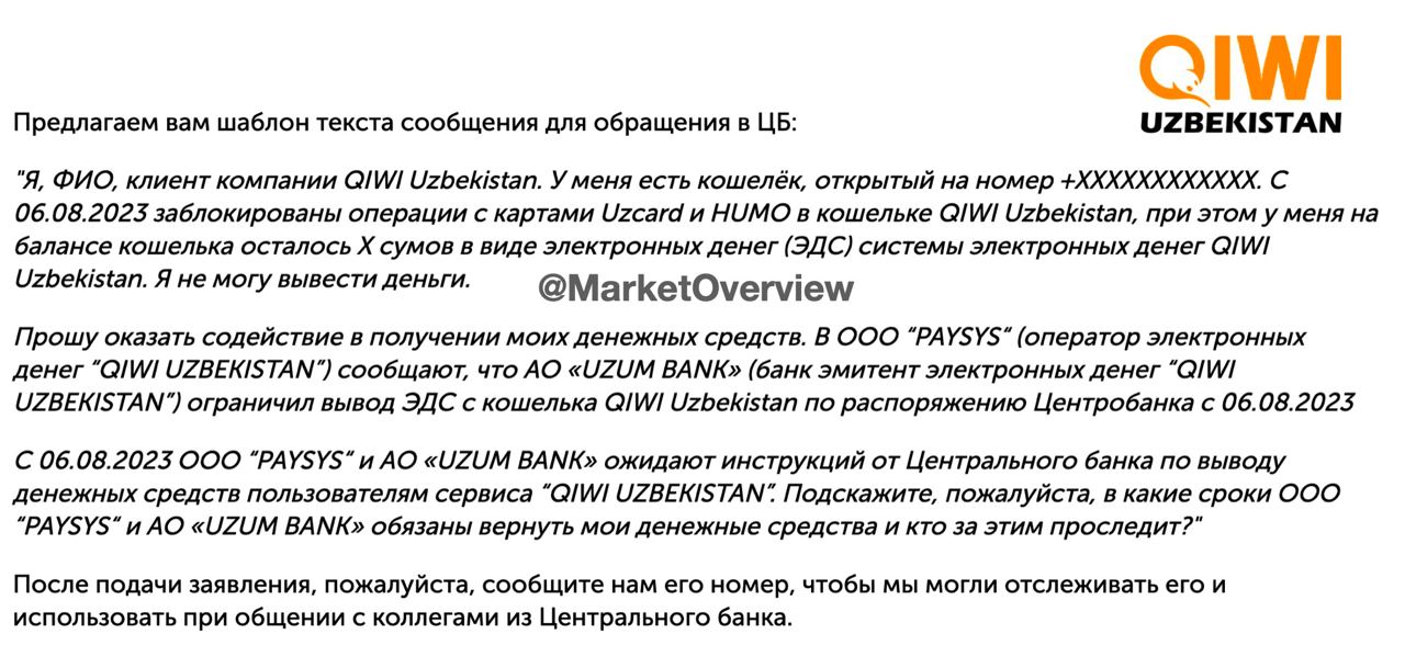 ● поддержка Qiwi Uz подготовил шаблон обращения в ЦБ Узбекистана, который можно использовать всем клиентам - на фото и в гайде promo.qiwi.uz/faq-today