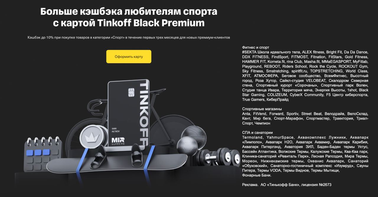 Если вы наконец-то решили взять абонемент в спортзал, купить велосипед или съездить отдохнуть в SPA, Тинькофф Premium подготовил для новых клиентов специальное предложение кэшбек 10% на покупки в категории Спорт: