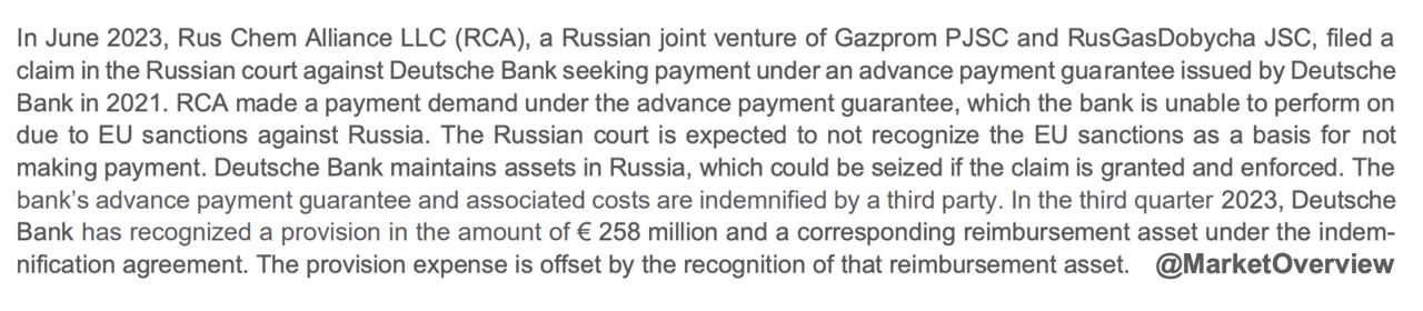 В отчете по итогам 9 месяцев 2023 Deutsche Bank пишет, что не может исполнить обязательства из-за санкций ЕС, но ожидается, что российский суд не признает наличие санкций как основание. В случае удовлетворения иска Дойче Банк и Технологический центр Дойче Банка будут кофискованы.