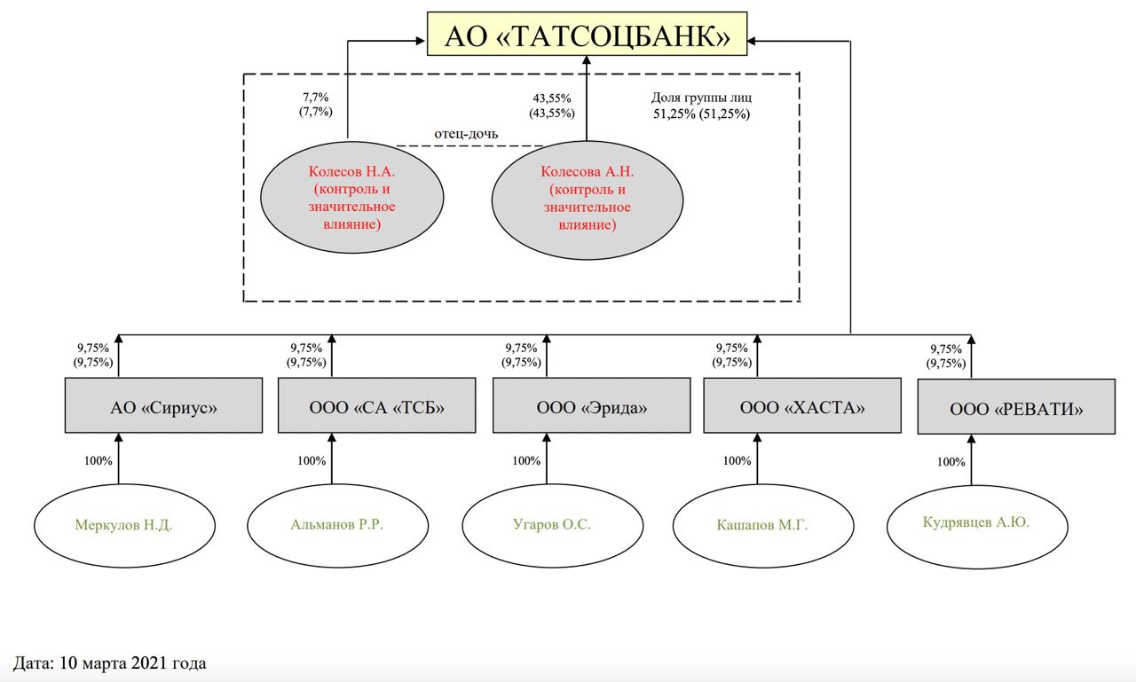 В итоге: по 14,625% акций теперь контролируют Эдуард Галиуллин и Евгений Сундеев, 9,75% - Павел Беляхин. Данных о долях других владельцах Татсоцбанка нет: 43,55% предправления Анастасия Колесова, 7,7% Николай Колесов (отец, экс-губернатор Амурской обл. - под санкциями Великобритании, Канады, Австралии и Украины), 9,75% Николай Меркулов (через АО Сириус).