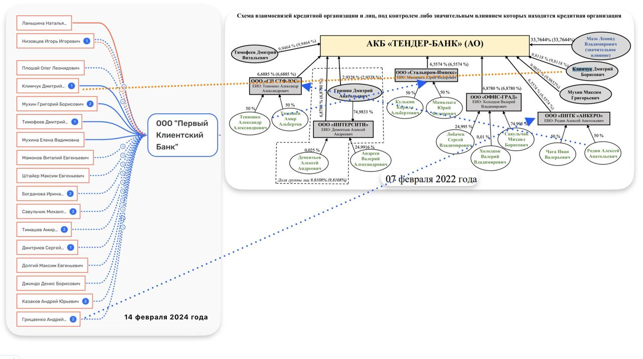За последние 3 года в капитал Тендер-Банка (Москва) зашли лица, афиллированные с Первым Клиентским Банком (ПКБ, Москва). Основные события развернулись летом-осенью 2023 г: в банке началась "Санта-Барбара" - акционеры выкупали друг у друга компании, некоторые выходили из состава учредителей банка, судя по актуальным данным о владельцах ПКБ и доступным на 7 февраля 2022 г. данных об акционерах Тендер-Банка - на фото: