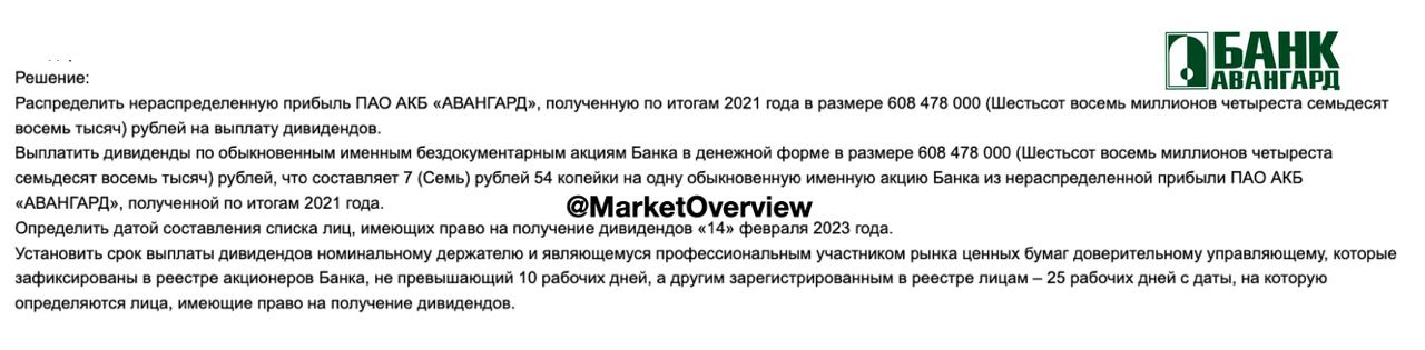 Банк Авангард решил заплатить дивиденды более 1,2 млрд руб за 2019 и 2021 г.г. из нераспределенной прибыли