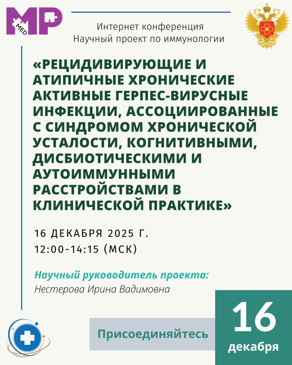 12:10-13:40 «Рецидивирующие и атипичные хронические активные герпес-вирусные инфекции, ассоциированные с синдромом хронической усталости, когнитивными, дисбиотическими и аутоиммунными расстройствами в клинической практике» Нестерова Ирина Вадимовна