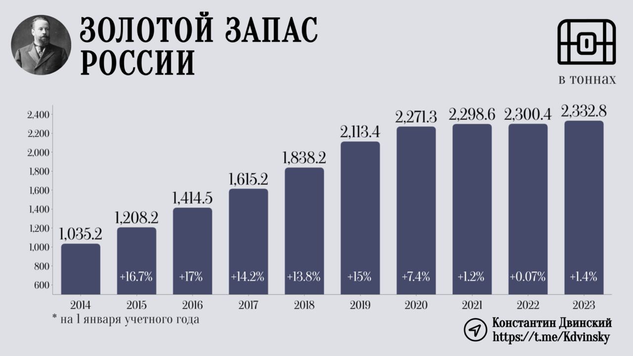 По итогам 2023 года золотой резерв России достиг рекордного значения. Его объем составил 2350 тонн, которые находятся в хранилищах Банка России. Правда, увеличение имеется символическое - только плюс 18 тонн за год (2332 тонны было на 1.01.23). Тем не менее…