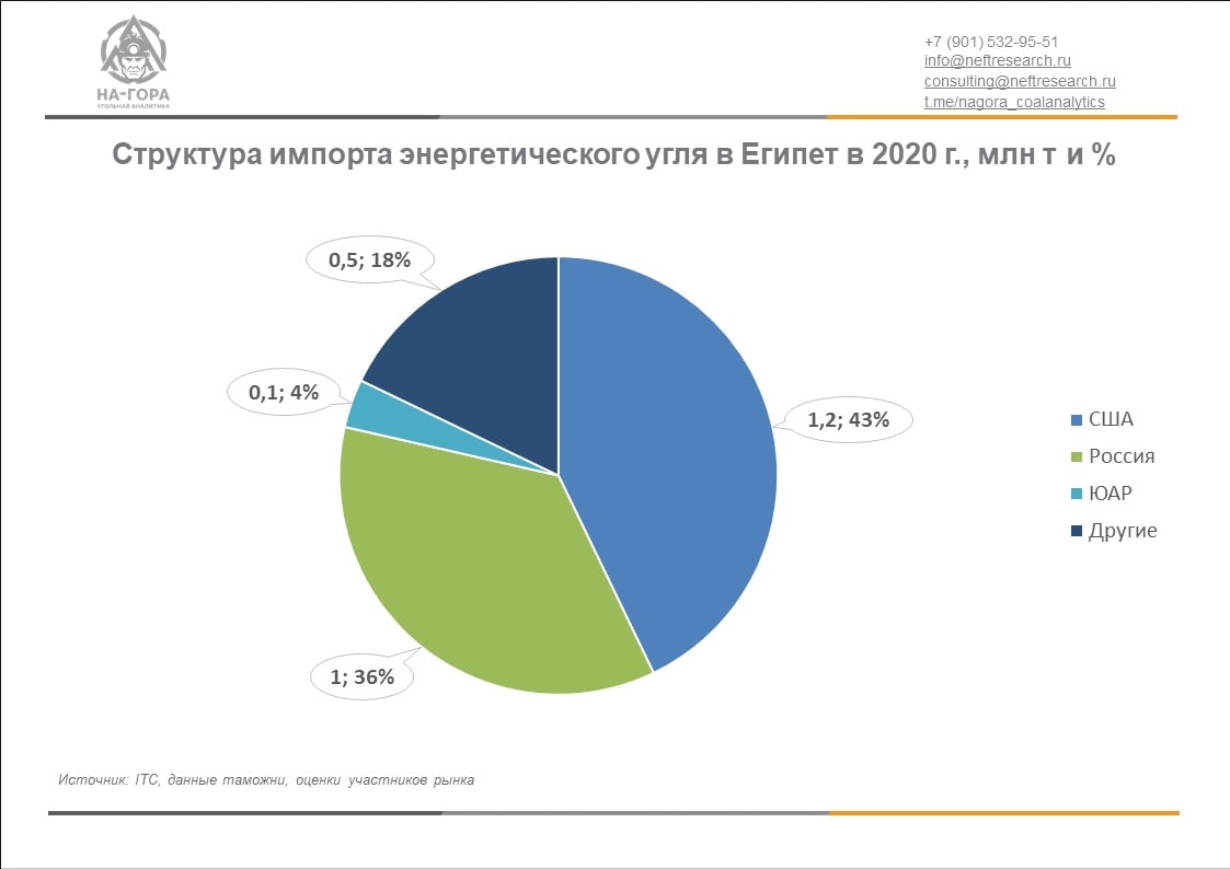 Импорт российского энергетического угля в Египет вырос в 2020 г. по сравнению с 2019 г. на 43%, примерно до 1 млн т. При этом доля российских поставок увеличилась за год примерно втрое – до 36%.