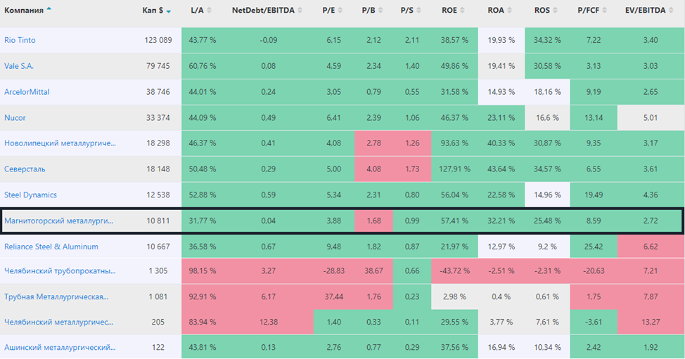 Отношение обязательств к активам 31,77%, отношение чистого долга к EBITDA составляет 0,04х – показатель платежеспособности один из лучших в мире среди аналогов. Окупаемость компании около 3,88, а форвардная окупаемость на 2023 год около 5, что выглядит очень дешево, исторически компания торговалась так дешево в 2016 году, а показатель средней окупаемости за последние 6 лет составляет 7,55. Отношение капитализации к капиталу 1,68, что выглядит дешевле аналогов. Отношение капитализации к выручке 0,99, что выглядит дешевле основных конкурентов. По показателю P/FCF (8,59) ММК выглядит дороже Северстали и на уровне НЛМК. По показателю EV/EBITDA (2,72) ММК и весь сегмент выглядит очень дешево.