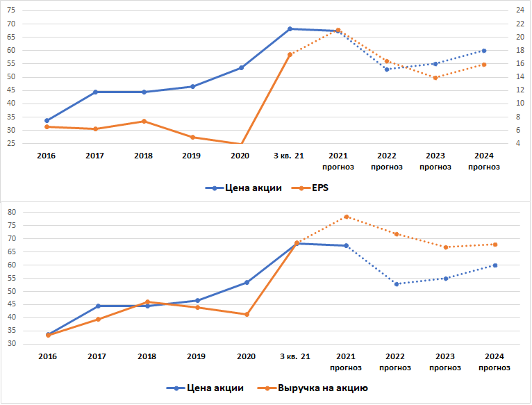 Если сравнить динамику стоимости акции и прошлую и будущую динамику EPS, то увидим, что в 2022-2023 гг существует очень большая вероятность коррекции капитализации компании.