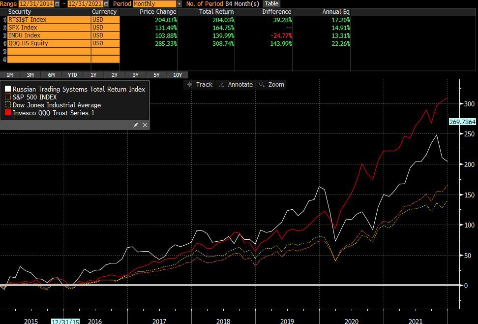 Кстати, после крымских событий, а точнее с начала 2015 года российский РТС дал 204% полной доходности. Это на 40% больше, чем S&P и на 60% больше, чем Dow.
