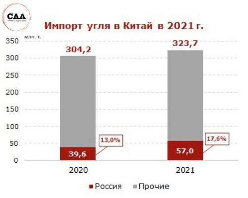 При этом КНР уже является крупнейшим импортером российского угля. На ее долю пришлось почти 18% или 39.6 млн. т. экспортных поставок в 2020 г. Совокупный экспорт российского угля в 2021 г. составил около 225 млн. т., из которых на поставки в Китай пришлось 57 млн. т. (+17.4 млн. т. или 44% к 2020 г.).