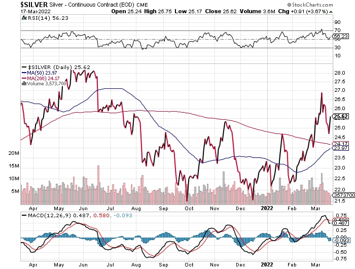 Технически серебро было довольно сильным. В первые несколько дней марта оно выросло вместе с долларом США, золотом, нефтью и множеством других сырьевых товаров. С тех пор оно откатилось назад, но отскочило сразу после того, как ФРС официально объявила о повышении ставки, и с тех пор остается на уровне около 25,50 доллара.