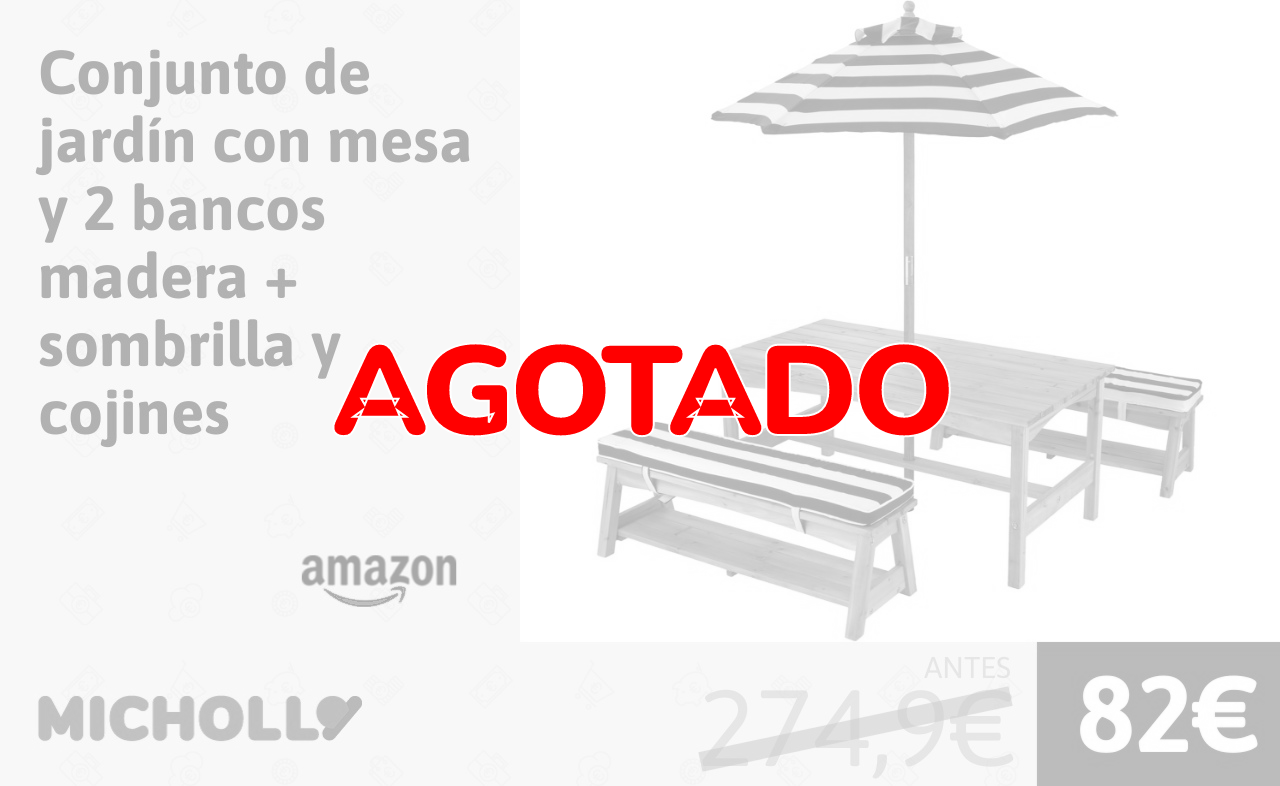 🔹 Conjunto de jardín con mesa y 2 bancos madera + sombrilla y cojines solo 82€❗️❤️ (PVP: 274,9€)