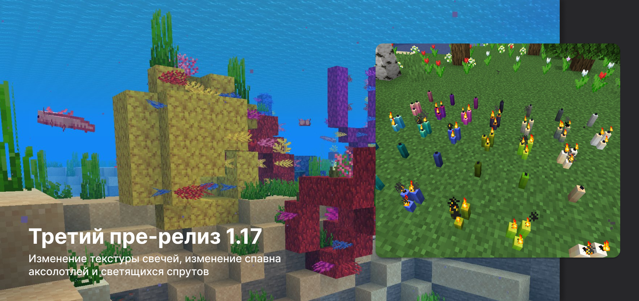 Вышел третий пре-релиз Minecraft 1.17. Список изменений: • Изменена текстура горящих свечей. • Мобы, которые были протаранены козлами, больше не буду им мстить. • Аксолотли и светящиеся спурты теперь спавнятся только в полной темноте, а также над каменными…