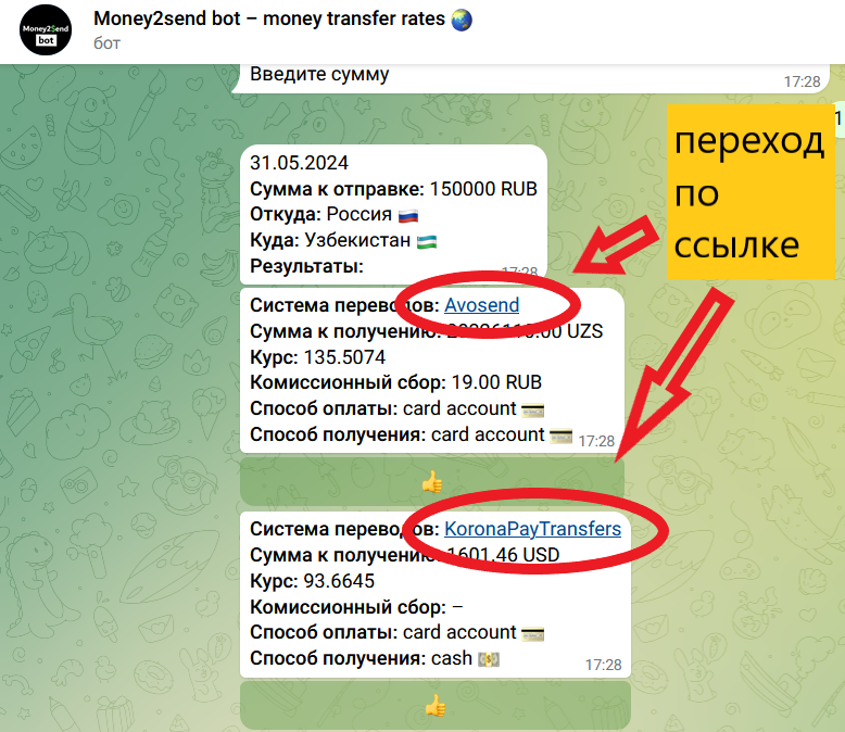 Для осуществления денежного перевода переходите по ссылке на сайт системы денежных переводов из результатов расчета бота ⬇️