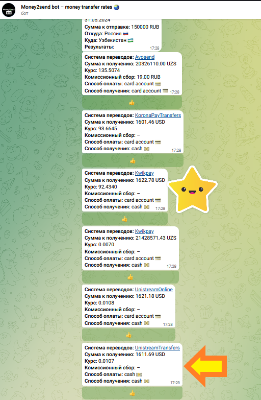 ✅ В итоге, благодаря @money2sendbot Имронбек узнал про курсы и комиссии разных систем, сэкономил $10 и ещё 1-2% на комиссии банка потому что не стал оплачивать перевод картой.😎