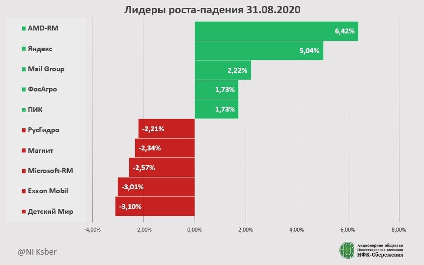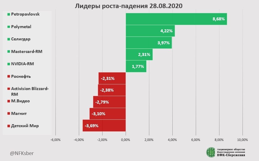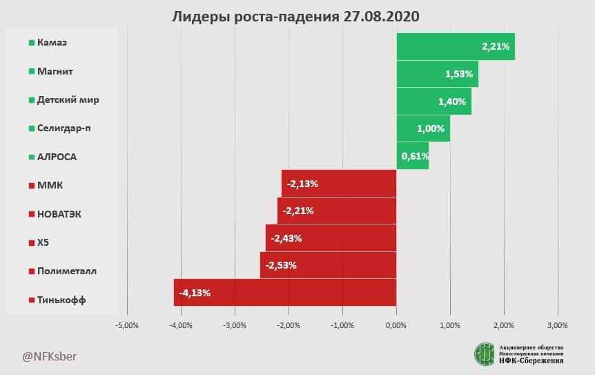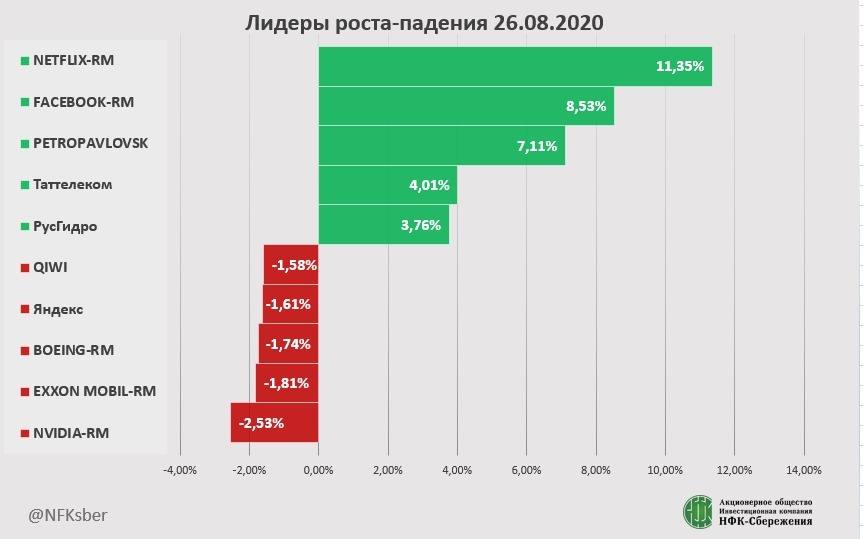 ▫️На российской бирже 26.08.2020 г. наблюдался активный рост котировок компании РусГидро, ожидающей публикации финотчетов за II кв. 2020 г. по МСФО. Своим ростом акции компании также обязаны новости о сохранении текущим генеральным директором Шульгиновым своей должности на ближайшие 5 лет. Котировки Сбербанка сегодня находились под воздействием геополитических рисков.