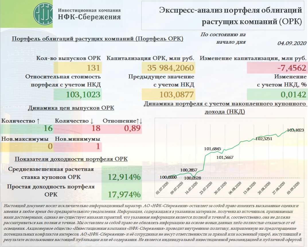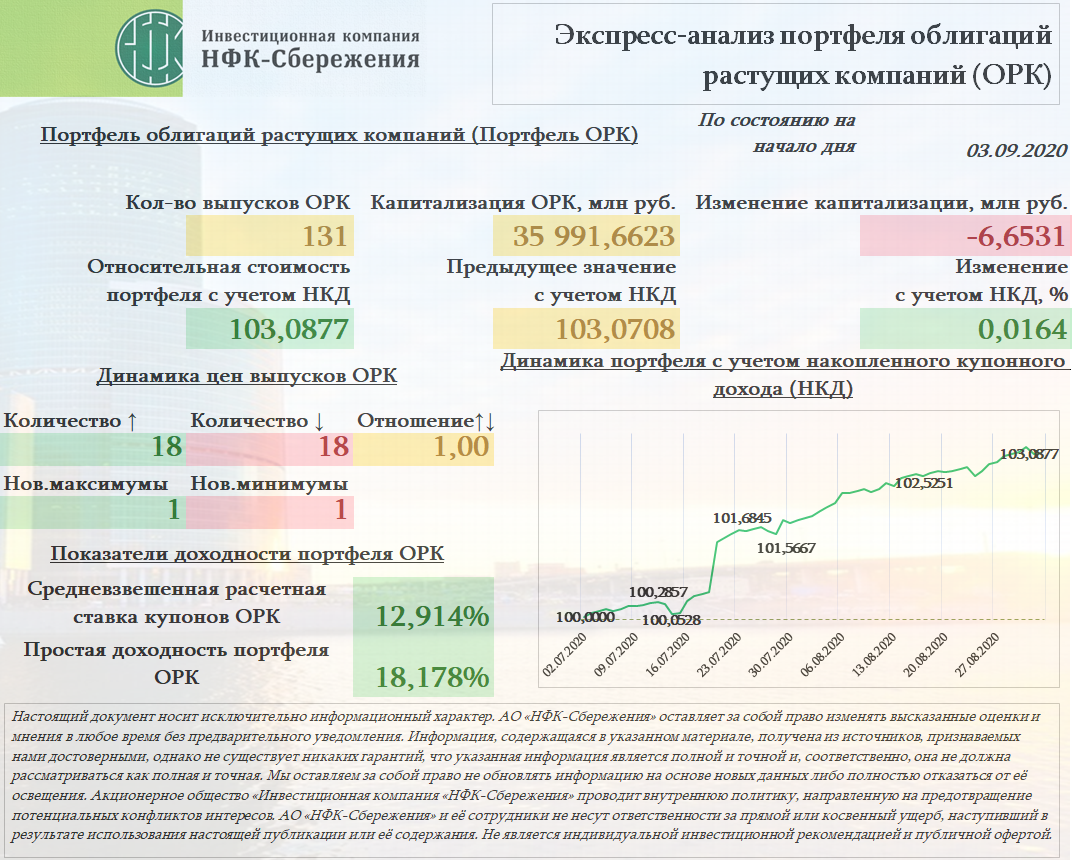 📊 В рамках последней торговой сессии августа состоялась стандартная ребалансировка портфеля ОРК в соответствии с утвержденными правилами. В портфель были включены 7 новых выпусков облигаций, таким образом, общее количество выпусков в портфеле достигло 131. Общая капитализация всех выпусков составляет 36,055 млрд руб. Существенное изменение дневной капитализации обусловлено не колебанием цен, а началом учета данных по новым выпускам.