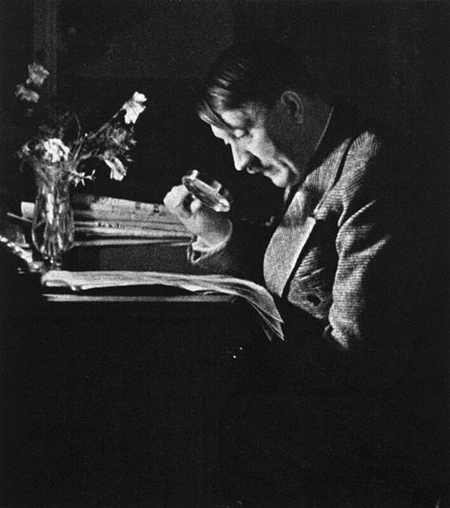 В качестве иллюстрации приводится фотография, на которой Адольф Гитлер читает газету с лупой в «Доме Вахенфельд», 16 января 1935 года.
