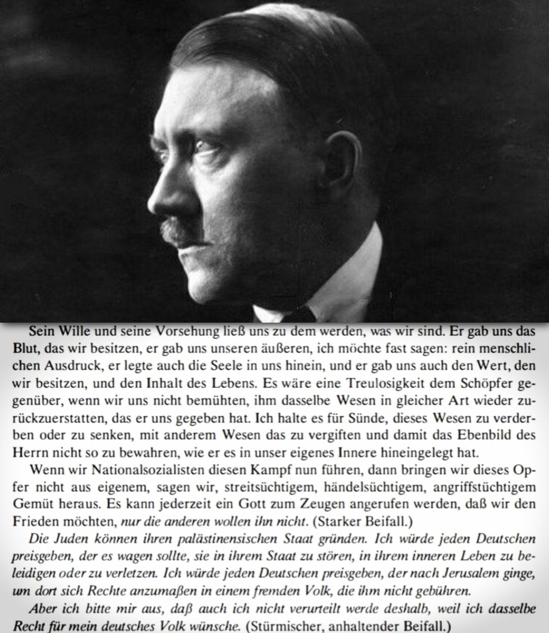 «Когда мы сегодня выступаем как немцы и пытаемся защититься от отравления другим народом, мы стремимся вернуть в руки всемогущего Творца то самое существо, которое он нам дал. Его воля и провидение сделали нас теми, кто мы есть. Он дал нам кровь, которую мы имеем, он дал нам нашу внешность — я бы даже сказал: чисто человеческий облик. Он вложил в нас душу, наделил нас ценностью и смыслом жизни. Было бы предательством по отношению к Творцу, если бы мы не старались вернуть ему то же самое существо таким же образом, каким он его нам дал. Я считаю грехом разрушать или умалять это существо, отравлять его чуждой сущностью и не сохранять образ Господа так, как он был вложен в наше внутреннее естество. [Отсылка на христианскую концепцию о сотворении Богом человека по образу Своему (Быт. 1:26-27) – прим. BaH.] Когда мы, национал-социалисты, ведём эту борьбу, мы приносим жертву не из-за нашего, скажем, склонного к ссорам, агрессивного или воинственного характера. В любой момент можно призвать Бога в свидетели, что мы стремимся к миру, но другие его не хотят.