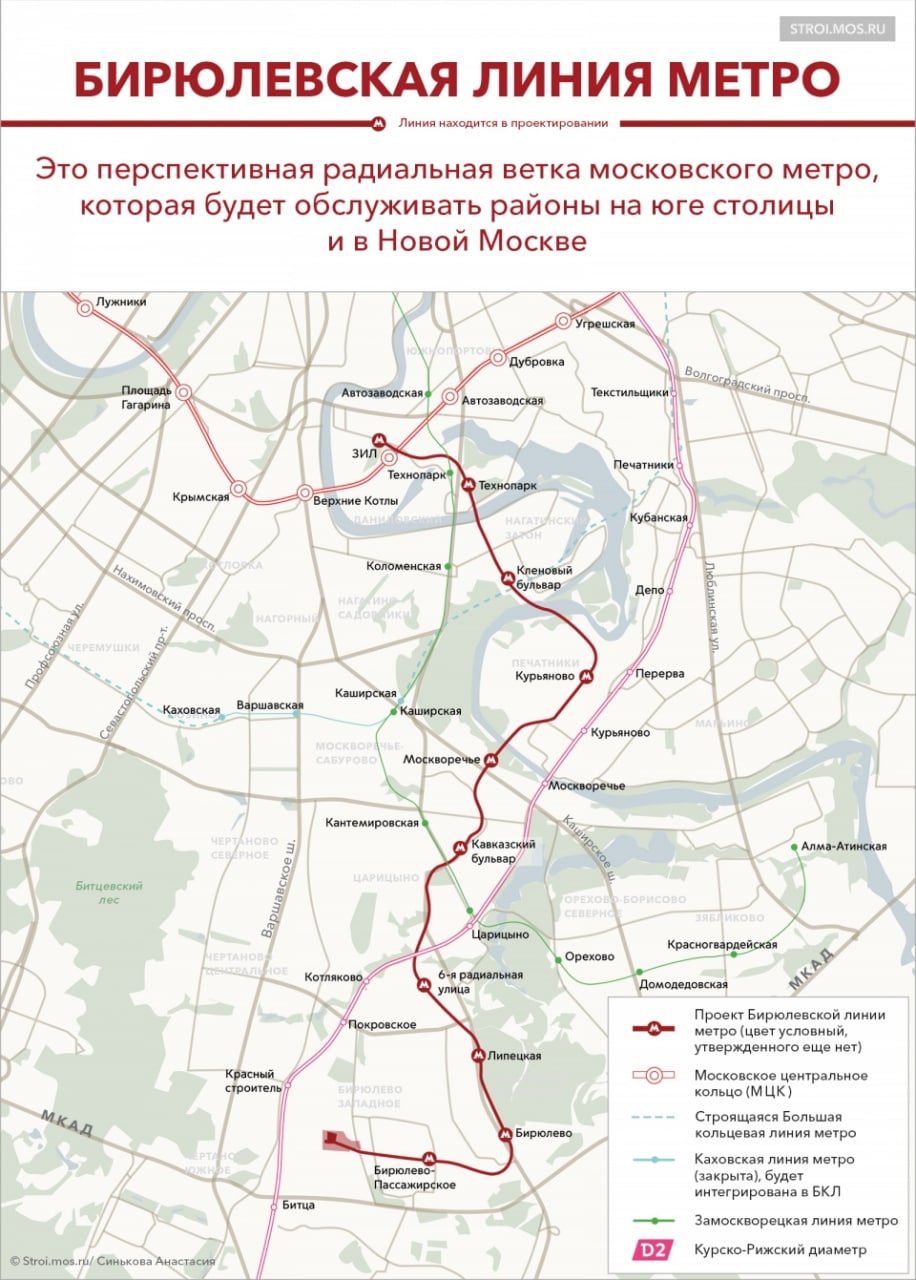 Подготовка к строительству Бирюлевской линии метро начнется в 2021 году, сообщил заместитель мэра по вопросам градостроительной политики и строительства Андрей Бочкарев. Линия пройдет от станции «ЗИЛ» в районы Бирюлево Восточное и Бирюлево Западное, на участке длиной 23 км будет 10 станций.