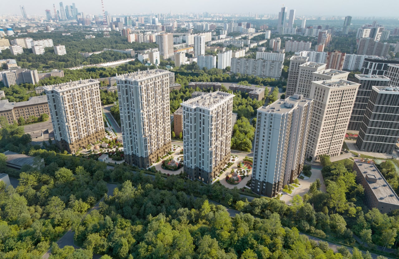 🏢 ЖК состоит из четырех корпусов высотой до 26 этажей. Дома окружены закрытым двором с собственным парком площадью 1 га. На территории парка появятся детские площадки, тренажеры, беговые дорожки, газон для занятий йогой, амфитеатр.